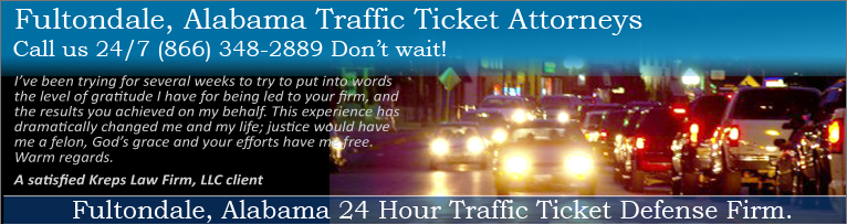 Have you been charged with speeding, reckless driving, running a red light or stop sign, or speeding 25 over in Fultondale, Alabama? You need the attorneys at Kreps Law Firm, LLC to fight your traffic charge. We will inform you of the options for fighting your traffic charge and answer your questions. Call Kreps (866) 348-2889 or CLICK HERE and let our experienced and knowledgeable attorneys fight your Fultondale, Alabama traffic charge.